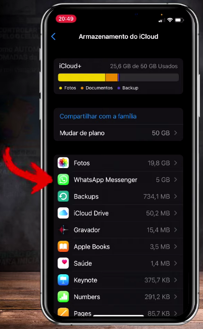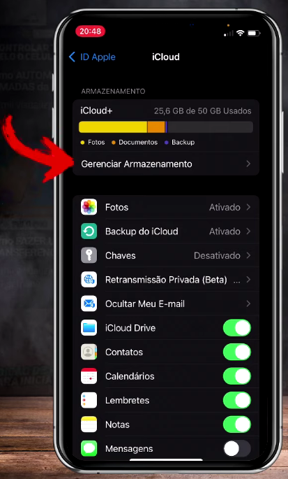 Acesse as configurações do seu smartphone e vá até a aba ‘iCloud‘, em seguida toque sobre ‘GERENCIAR ARMAZENAMENTO‘ para visualizar quanto de espaço cada aplicativo está consumindo no seu plano.