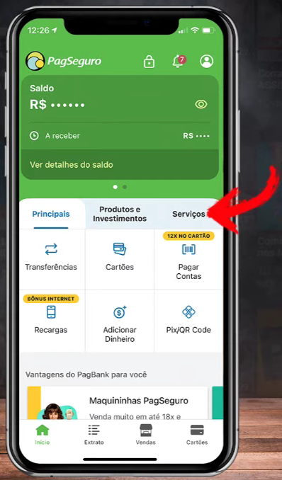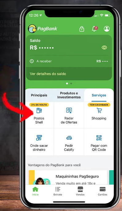 Abra o aplicativo do PagBank e vá até a aba de ‘SERVIÇOS‘, localizada logo abaixo das informações de saldo da conta. Em seguida toque sobre a opção ‘POSTOS SHELL’ e vá para o próximo passo.