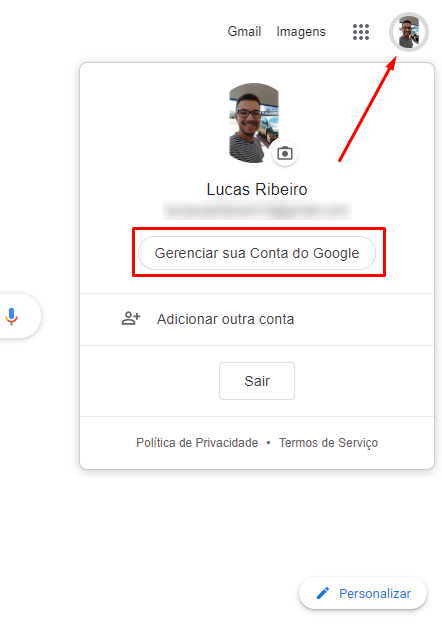 Abra o seu navegador – neste caso o Chrome – e vá até a sua conta do Google. No Chrome basta tocar sobre sua foto de perfil que está localizada no canto superior direito. Tendo feito isso toque sobre ‘GERENCIAR SUA CONTA DO GOOGLE‘.