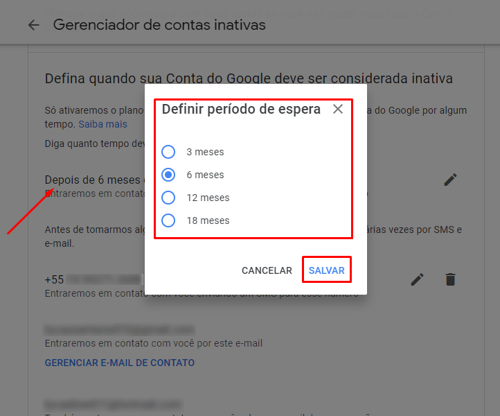 Agora selecione o período de espera que deverá ser aguardado para que a conta seja considerada como inativa; o máximo é de 1 ano e 6 meses. Logo abaixo é possível informar o número de telefone e endereço de e-mail para contato.