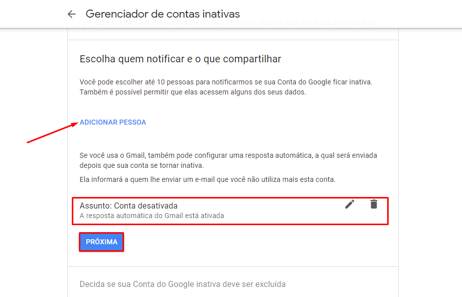 Caso queira também é possível informar uma lista de 10 contatos que serão notificados a partir do momento que sua conta do Google for considerada inativa. Além disso, outro recurso que está disponível é de mensagem automática, que será enviada caso você receba um e-mail.