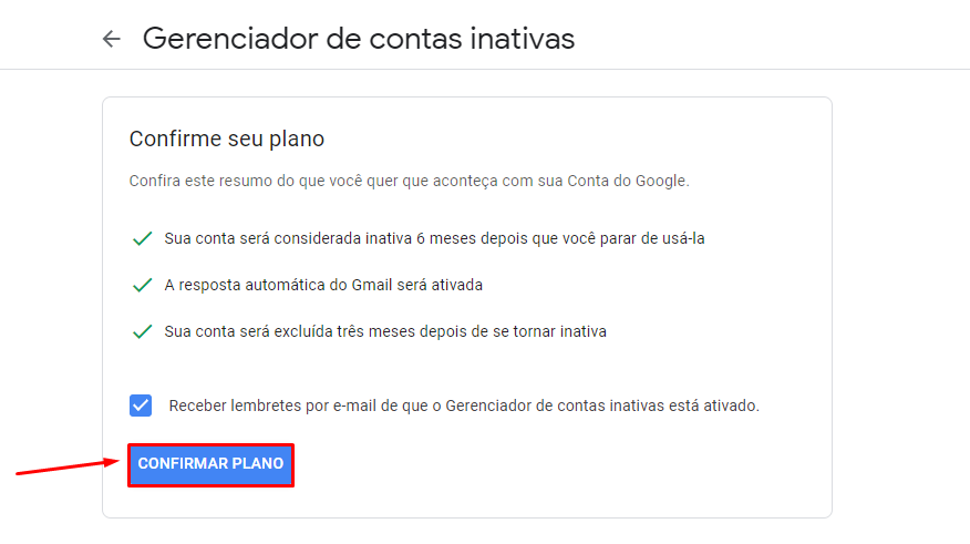 Por fim, revise seus dados e habilite ou não a exclusão da conta. Em seguida pressione sobre o botão ‘CONFIRMAR PLANO‘. Pronto, agora sua conta será excluída automaticamente em caso de inatividade.