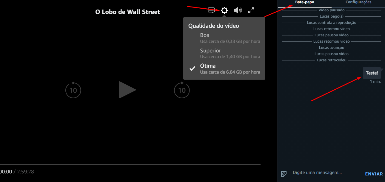 Na área de exibição é possível ajustar a qualidade do vídeo (boa, superior ou ótima) e acessar o bate-papo. Todas às alterações serão mostradas no histórico da conversa.