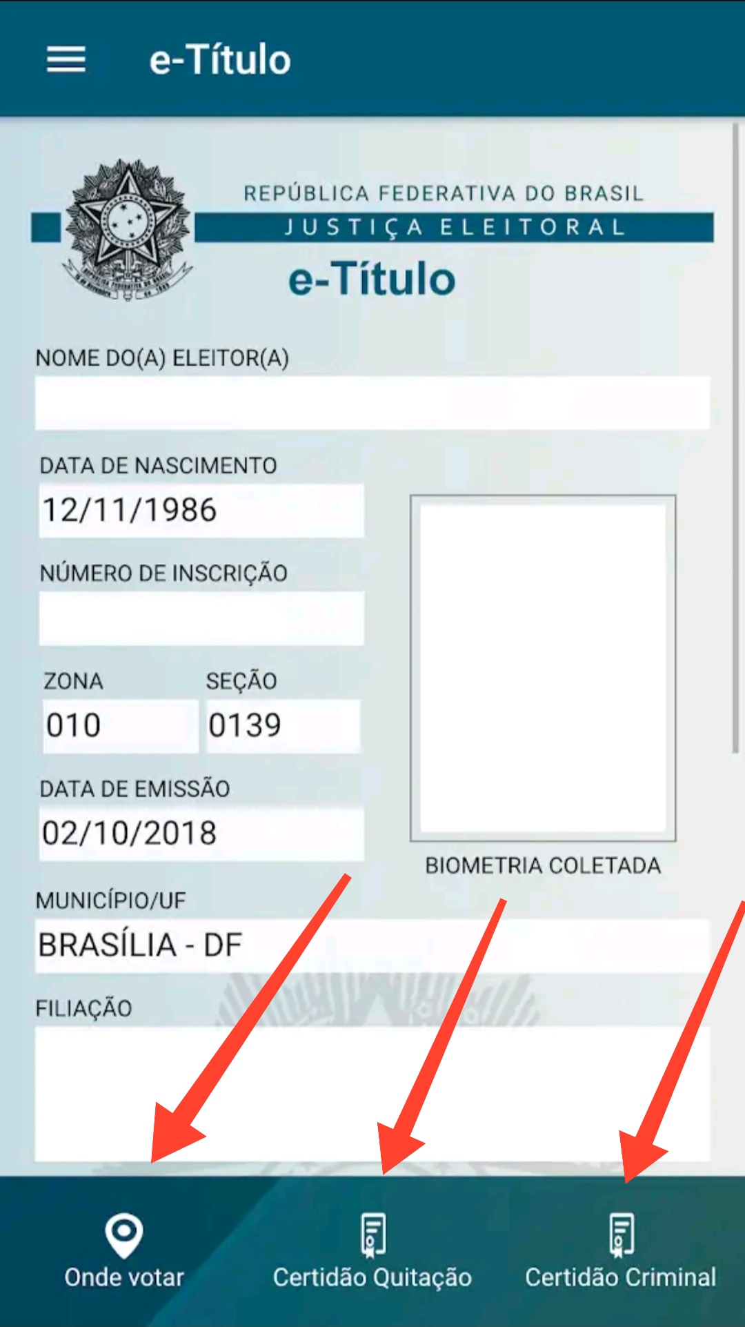 Na parte inferior é possível navegar por algumas opções, sendo elas: seu local de votação, certidão de quitação ou certidão de crimes eleitorais.