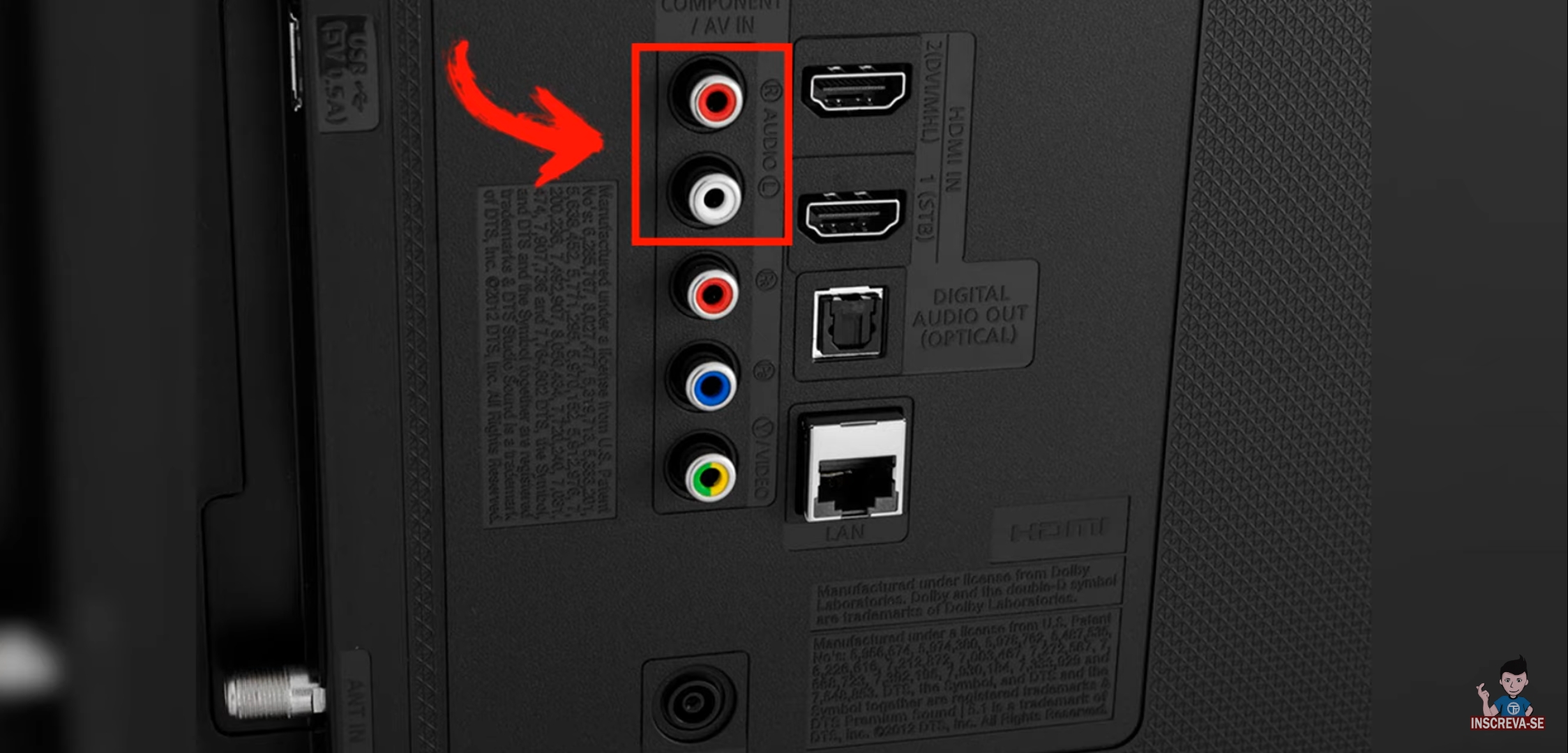 Caso sua TV não tenha essa entrada de áudio basta utilizar os cabos coloridos e conectá-los na entrada vermelha e branca, respectivamente. Veja: