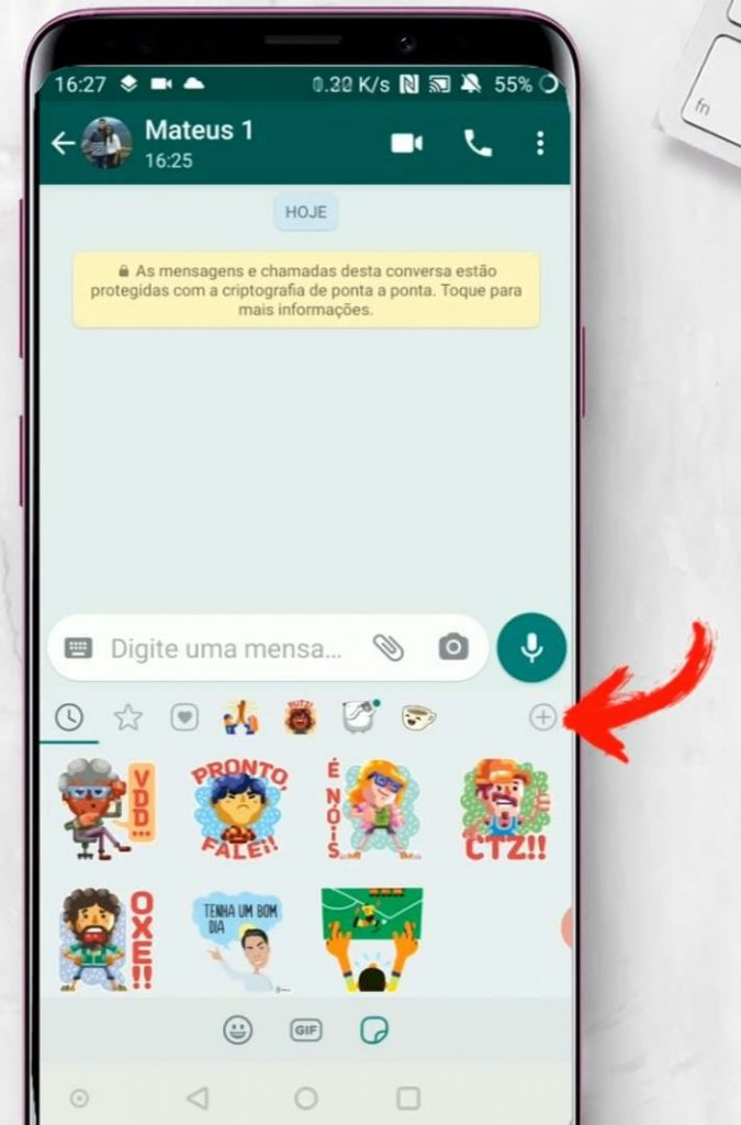 Agora abra o WhatsApp e vá até a área das figurinhas. Em seguida toque sobre o ícone ‘mais’ localizado no canto superior direito. Veja:
