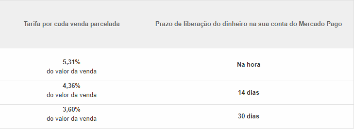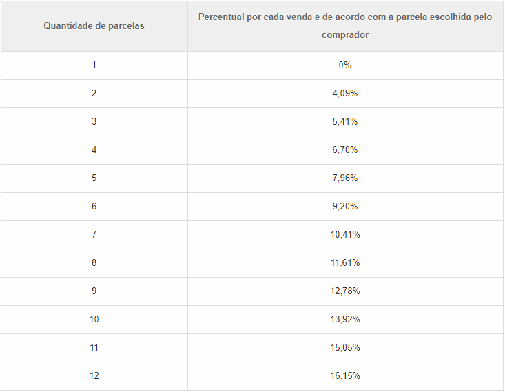 Além da taxa de recebimento, o vendedor também deverá somar a tarifa que é calculada de acordo com a quantidade de parcelas escolhida pelo cliente. Confira na imagem abaixo: