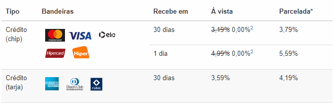- Taxa zero nos primeiros 3 meses ou até atingir R$1.500,00 em vendas;