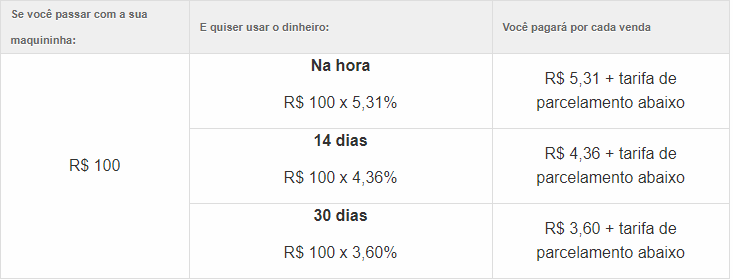 Como você pôde observar, a PagSeguro não disponibiliza o dinheiro no mesmo dia, mas o vendedor poderá optar em recebê-lo após 30 dias ou, se preferir, em 1 dia após a transação, porém pagando uma taxa maior. Para vendas parceladas utilizando o cartão de crédito a taxa é relativamente maior, sendo de 3,79% para recebimento em 30 dias e 5,59% para recebimento em 1 dia.