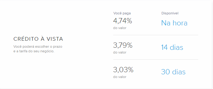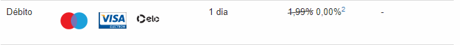 Felizmente para pagamentos feitos através de cartões de débito às tarifas são menores: 1,99% para recebimento em 1 dia – isso após os 3 meses iniciais ou quando atingir os R$1.500,00 em vendas.