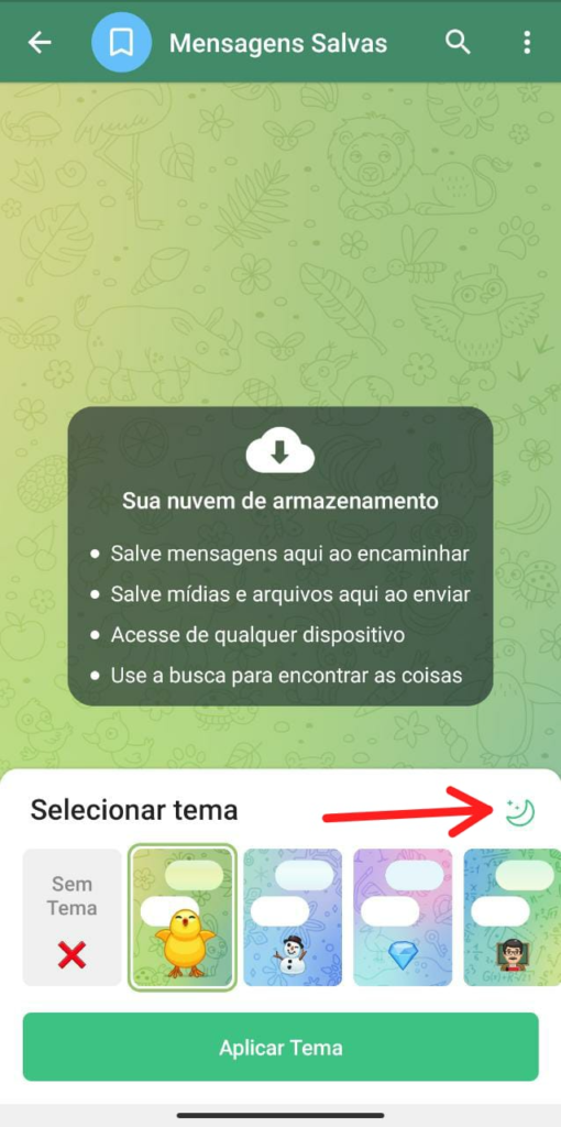 Há temas compatíveis com o modo claro ou escuro, bastando tocar sobre o ícone de Sol ou Lua — indicado pela seta na segunda imagem.