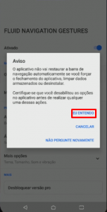 Passo 4: No aplicativo, marque a engrenagem para habilitar o aplicativo e conceder permissão para sobrepor outros aplicativos e depois em Ocultar barra de Navegação, e em seguida clique em Eu entendo: