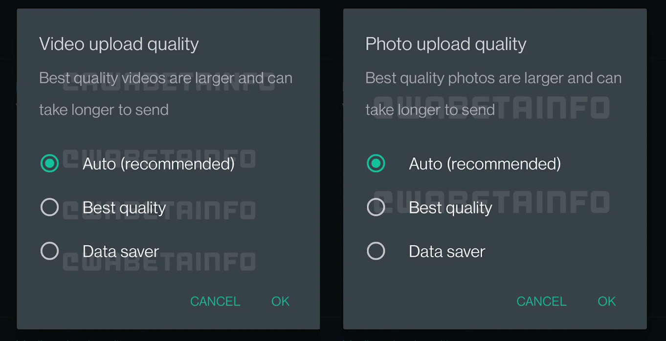 Nas imagens divulgadas pelo WABeta Info é possível observar que há três opções que podem ser selecionadas antes do envio de uma foto ou vídeo: automático, melhor qualidade e economia de dados, que envia em uma resolução menor para poupar internet.