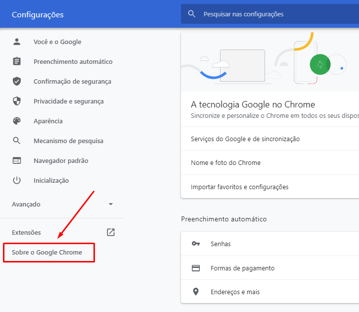 - Em seguida toque na opção ‘SOBRE O CHROME’, que está localizada no menu lateral esquerdo;