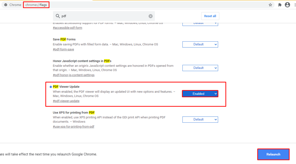 Na barra de pesquisa digite o seguinte comando: “Chrome://flags” e em seguida procure procure por PDF. Localize a função de ‘PDF VIEWER UPDATE‘ e marque ‘ENABLE‘.