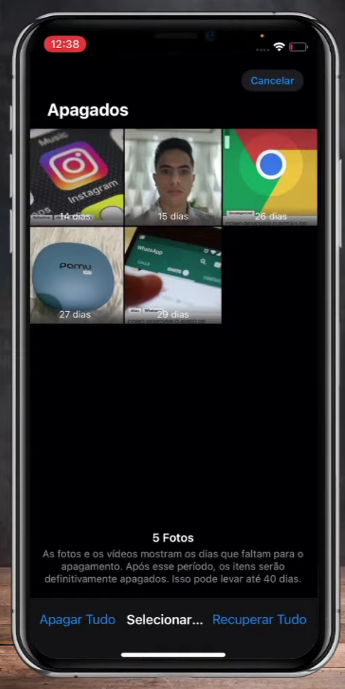 Nesta etapa você verá todas as fotos e vídeos apagados, observe que sobre cada miniatura há uma data referente ao tempo restante até que a mídia seja permanentemente excluída. Para recuperar um arquivo individualmente selecione-o e posteriormente vá em ‘RECUPERAR‘.