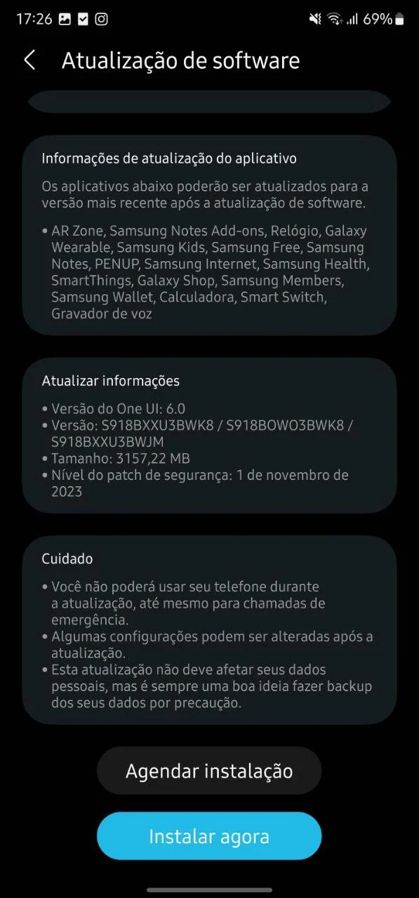 A novidade foi bem recebida pela comunidade de proprietários de modelos Galaxy S23, S23 Plus e S23 Ultra, que compartilharam nas redes sociais o recebimento da notificação de update. As versões de firmware são S918BXXU3BWK8 / S918BOWO3BWK8 / S918BXXU3BWJM, respectivamente. A OneUI 6.0 com Android 14 pesa 3,24 GB e a instalação requer conexão à Internet.