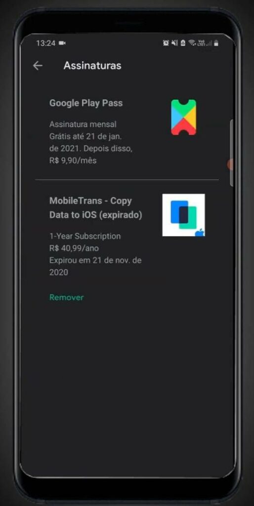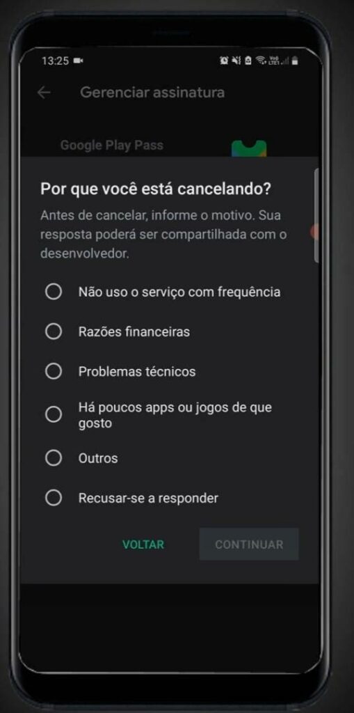 Toque sobre a assinatura do Play Pass e em seguida selecione a opção ‘CANCELAR ASSINATURA‘, tendo feito isso indique um dos motivos do cancelamento e pressione sobre ‘CONTINUAR’.