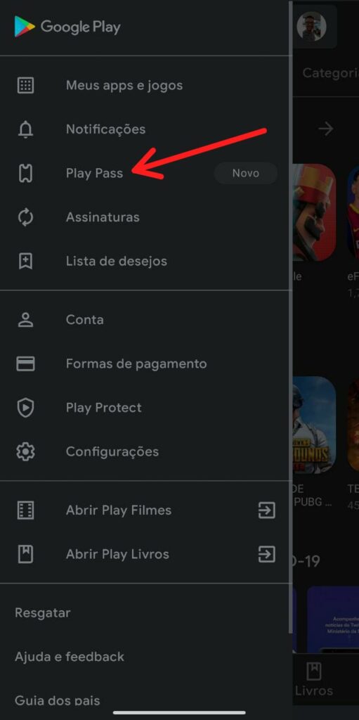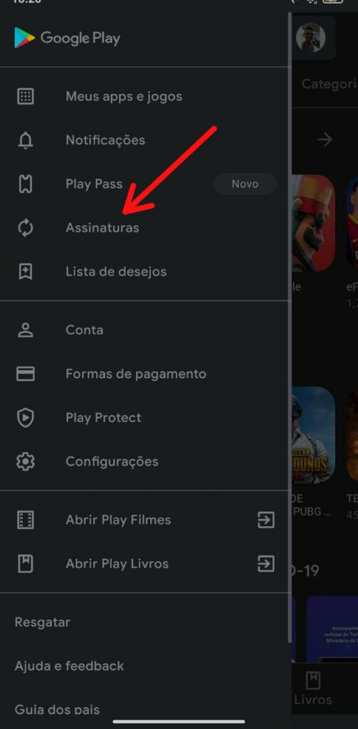 Abra o aplicativo da Play Store, acesse o menu lateral e toque sobre a opção ‘ASSINATURAS‘ e localize o Play Pass. Veja: