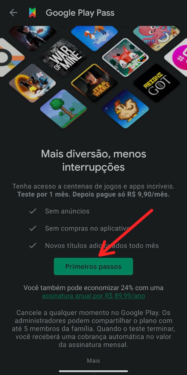 2. Toque sobre a opção ‘Play Pass’ e em seguida vá em ‘Primeiros passos’;