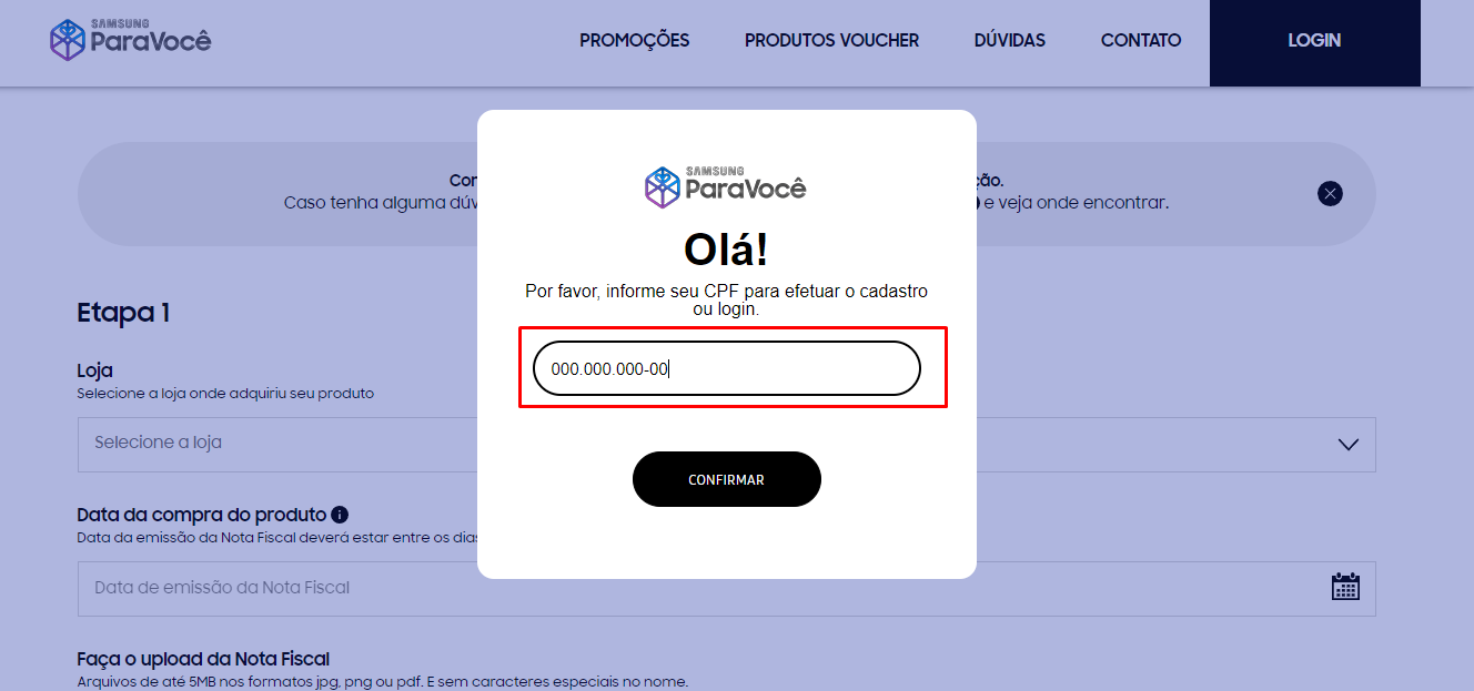 Nesta etapa informe seu CPF e toque em confirmar, tendo feito isso você deverá completar as demais informações para que o brinde seja autorizado.