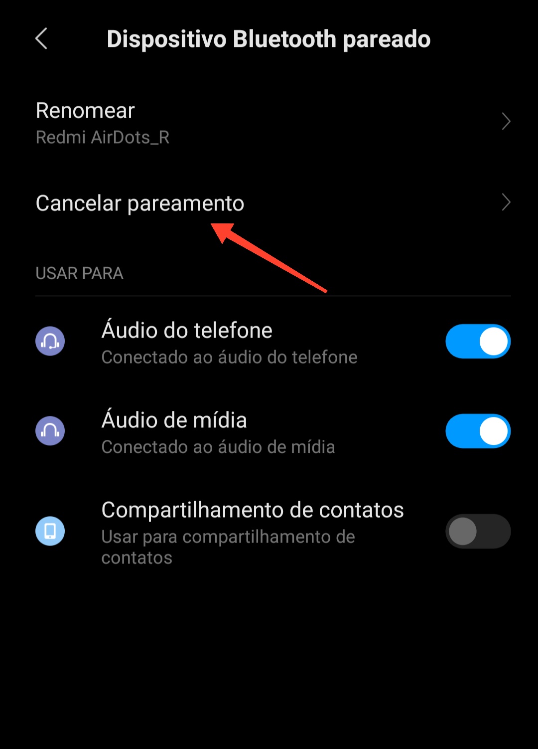 Inicialmente você deverá esquecer os Airdots do bluetooth de seu aparelho, para isso vá em: configurações > bluetooth > Redmi Airdots_R >esquecer/cancelar pareamento > desligue o bluetooth.