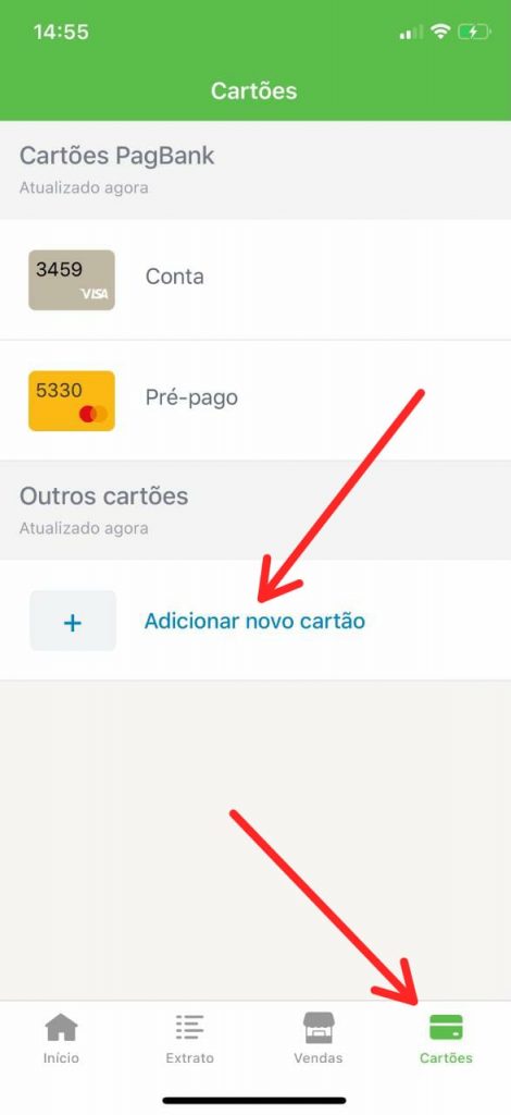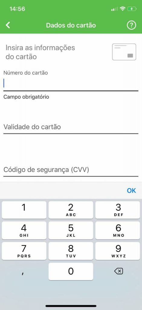 Para inserir um novo cartão toque sobre ‘CARTÕES‘ no menu inferior e em seguida toque sobre ‘ADICIONAR NOVO CARTÃO‘, por fim informe o número, data de validade e código de segurança.