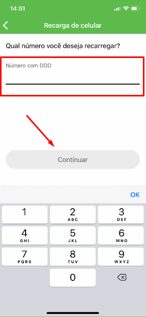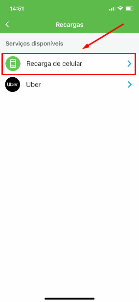 Agora selecione a opção ‘RECARGA DE CELULAR‘ e em seguida informe seu número de telefone. Ex. (11) 99999-9999.