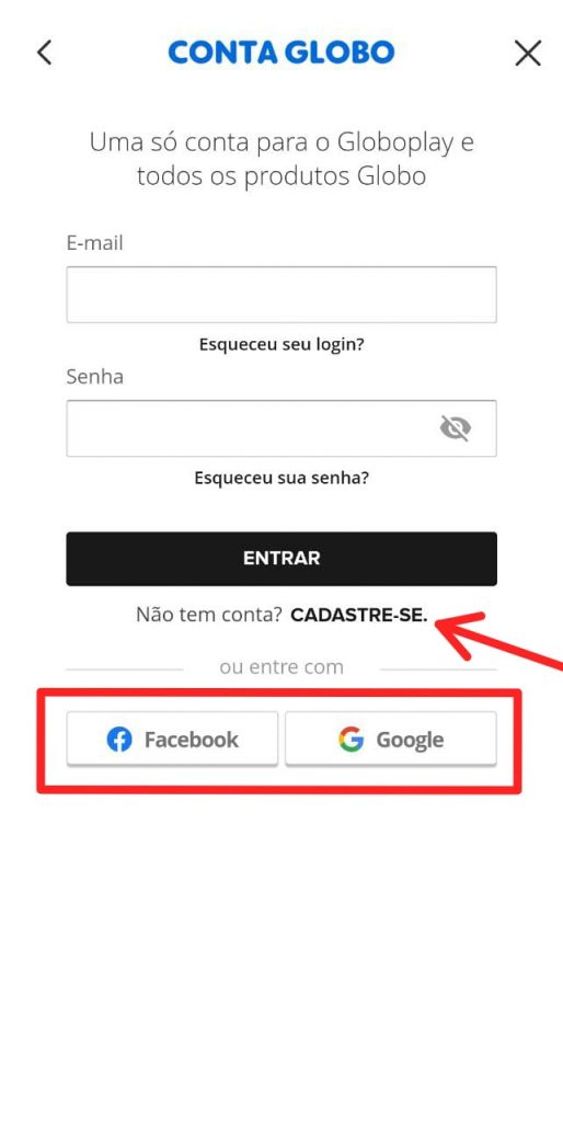 Logo após ter feito a instalação do aplicativo Globoplay você deverá criar uma conta de acesso; isso pode ser feito utilizando um endereço de e-mail ou sua conta do Google ou Facebook. Veja: