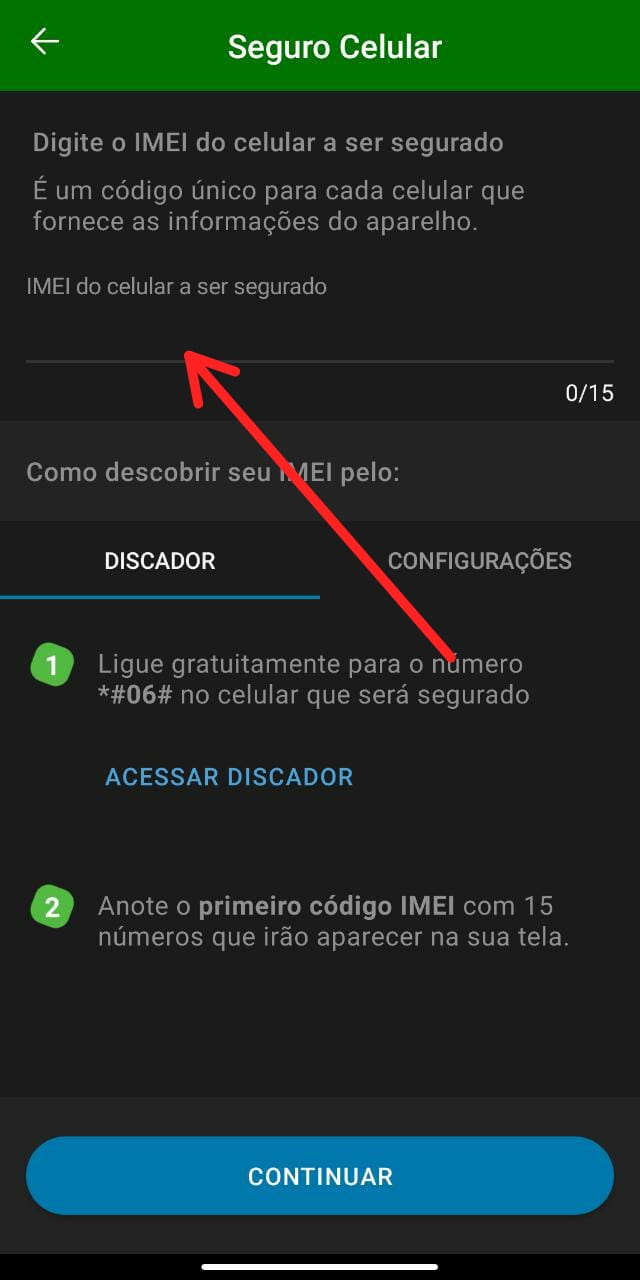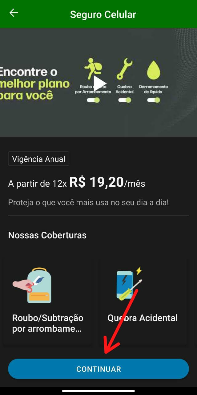 Nesta etapa selecione qual tipo de seguro deseja contratar — há várias opções, incluindo residencial, pessoal ou saúde — e em seguida toque sobre o botão ‘CONTINUAR‘.