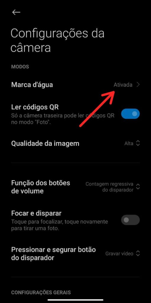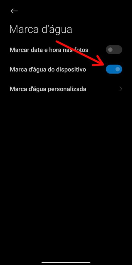 Nesta etapa toque sobre a primeira opção e em seguida desabilite a função de ‘MARCA D’ÁGUA DO DISPOSITIVO‘. Tendo feito isso às próximas fotografias não terão mais a indicação do modelo no canto inferior esquerdo.