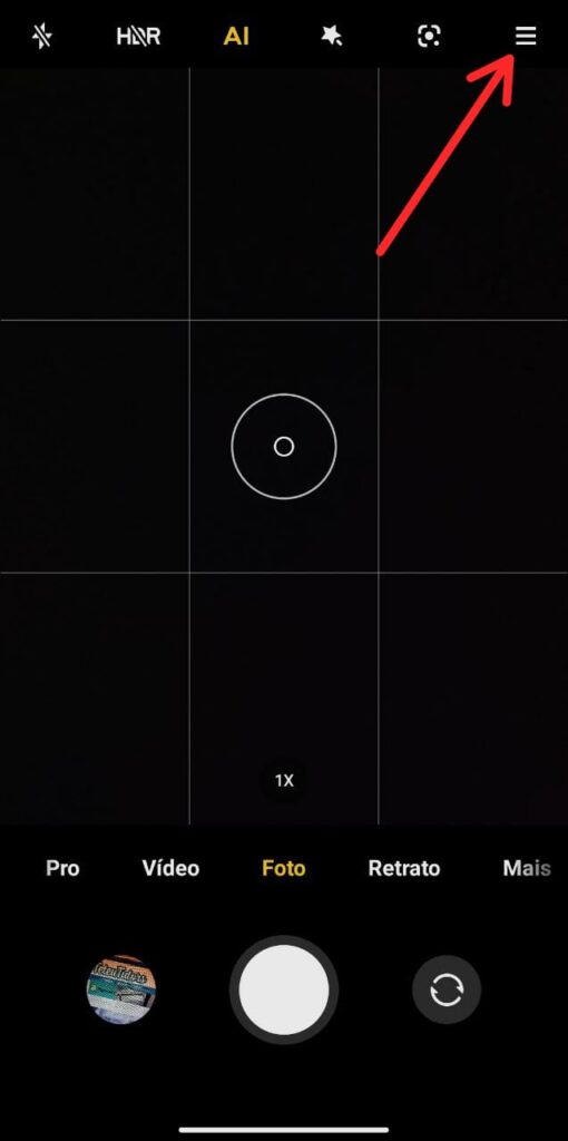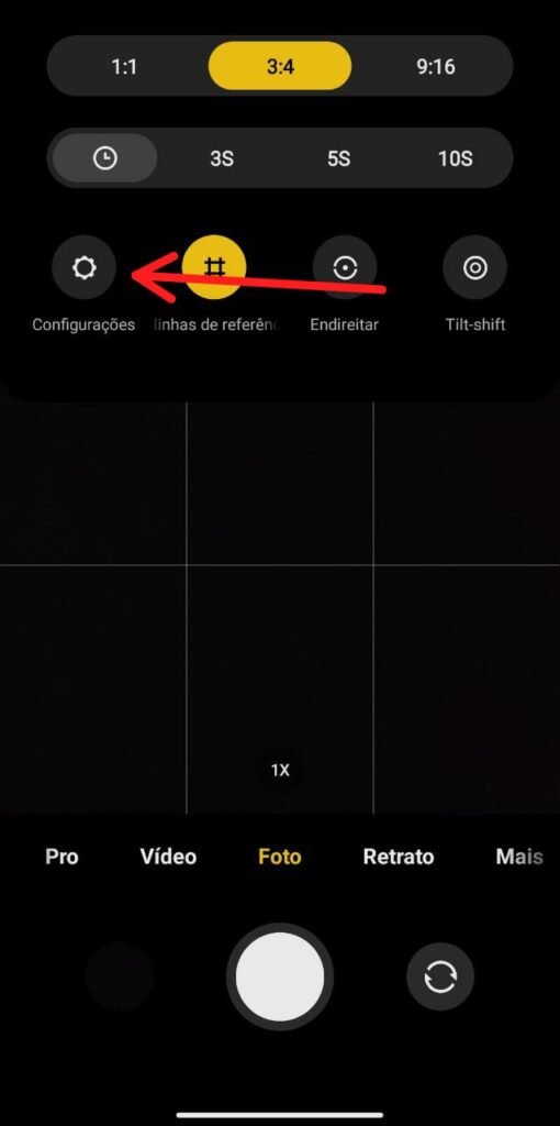 Abra a câmera nativa do seu Xiaomi e toque sobre as três barras localizadas no canto superior direito. Em seguida toque no ícone de ‘CONFIGURAÇÕES‘.