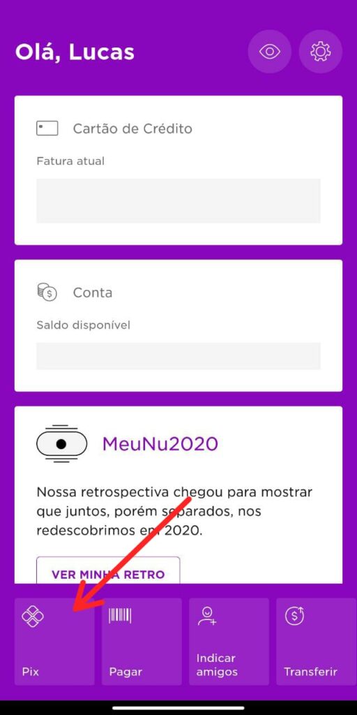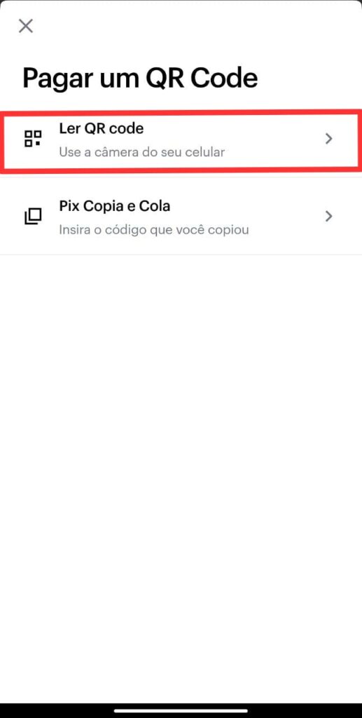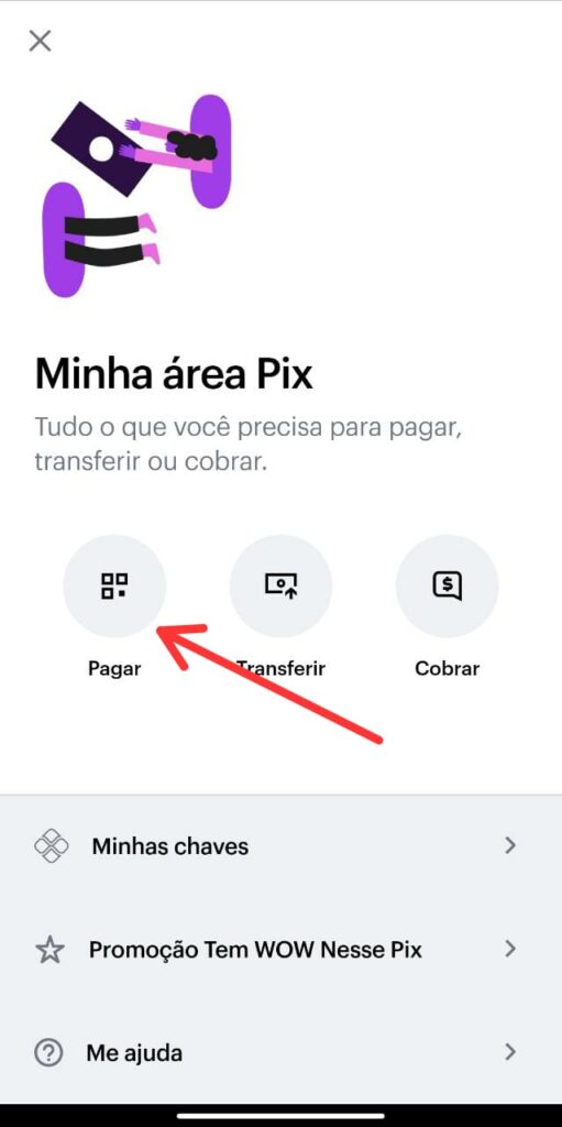 Abra o aplicativo do banco e busque pela área do PIX e selecione a opção ‘PAGAR‘. Nesse exemplo utilizamos o aplicativo da Nubank, ou seja, pode variar de acordo com sua instituição bancária.