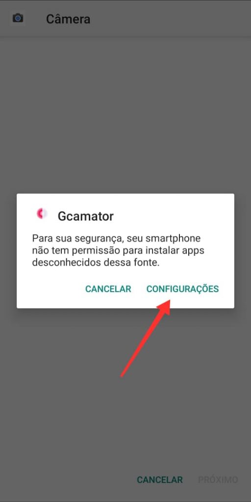 O procedimento acima não funciona para a versão 9 do Android, neste caso é necessário tocar sobre ‘configurações‘ e permitir o download a partir do GCamator. Veja:
