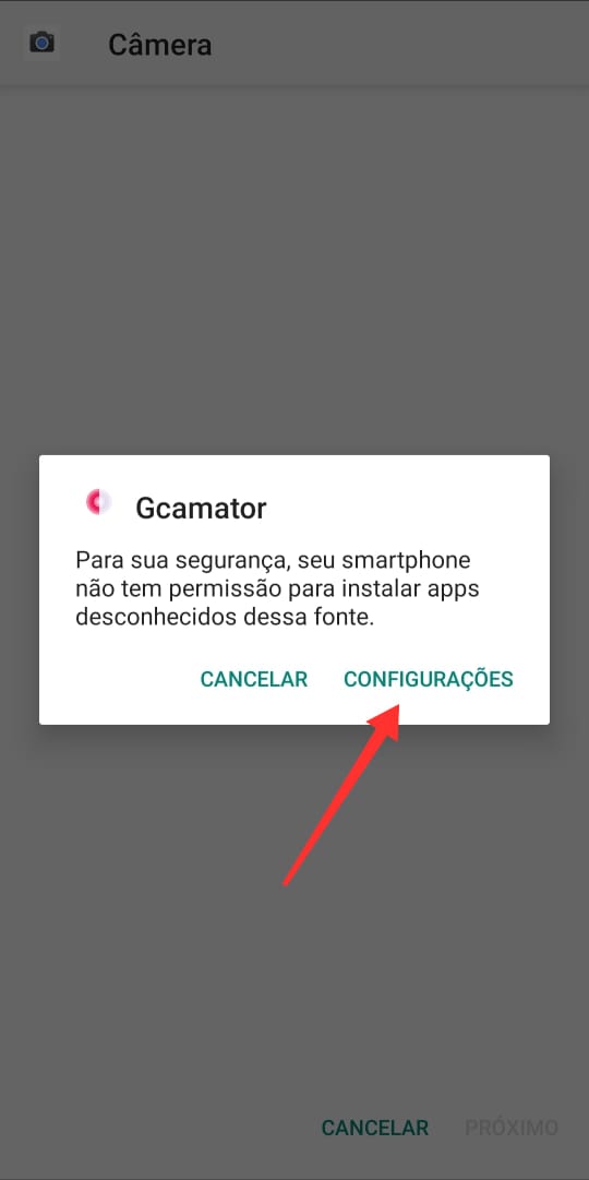 O procedimento acima não funciona para a versão 9 do Android, neste caso é necessário tocar sobre ‘configurações‘ e permitir o download a partir do GCamator. Veja: