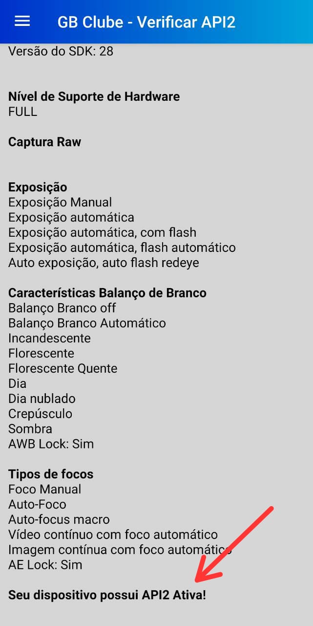 Abra o GB Clube e acesse o menu lateral, em seguida toque sobre ‘Verificar API2‘, nesta página será possível identificar às funções disponíveis em seu smartphone e se a CâmeraAPI2 está habilitada.