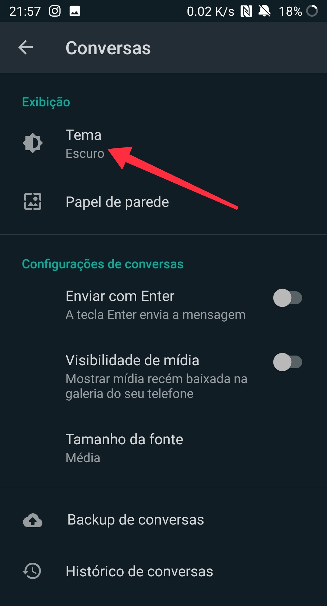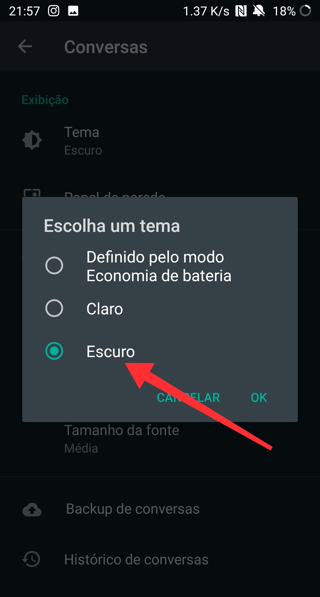 Observe que há a configuração “tema“, toque sobre e em seguida selecione o tema escuro.