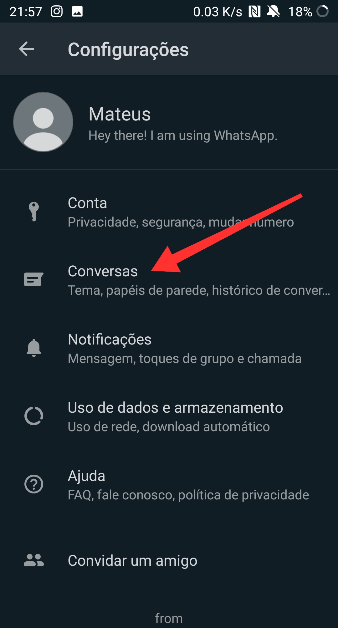Abra seu Whatsapp e vá até às configurações > conversas.