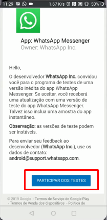 Infelizmente o programa para se tornar um testador beta do WhatsApp atingiu o limite de participações, porém ainda é possível entrar no programa sem o uso de aplicativos e de forma oficial, recebendo às atualizações pela própria Play Store.
