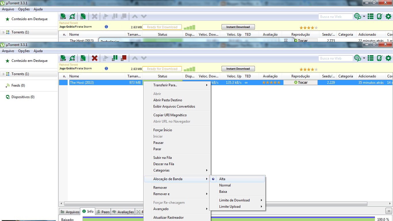 06: Clique com o botão direito do mouse sobre seus downloads. Mova o mouse até “Alocação de Banda” e marque “Alta”. Faça isso para todos os seus downloads;