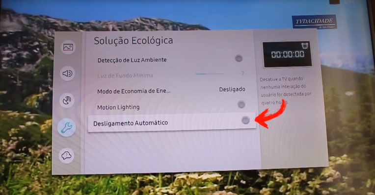 Se ativada, este recurso faz com que a TV desligue após 4 horas de inatividade. Para desabilitar vá em configurações > soluções ecológicas > desligamento automático > desativar.