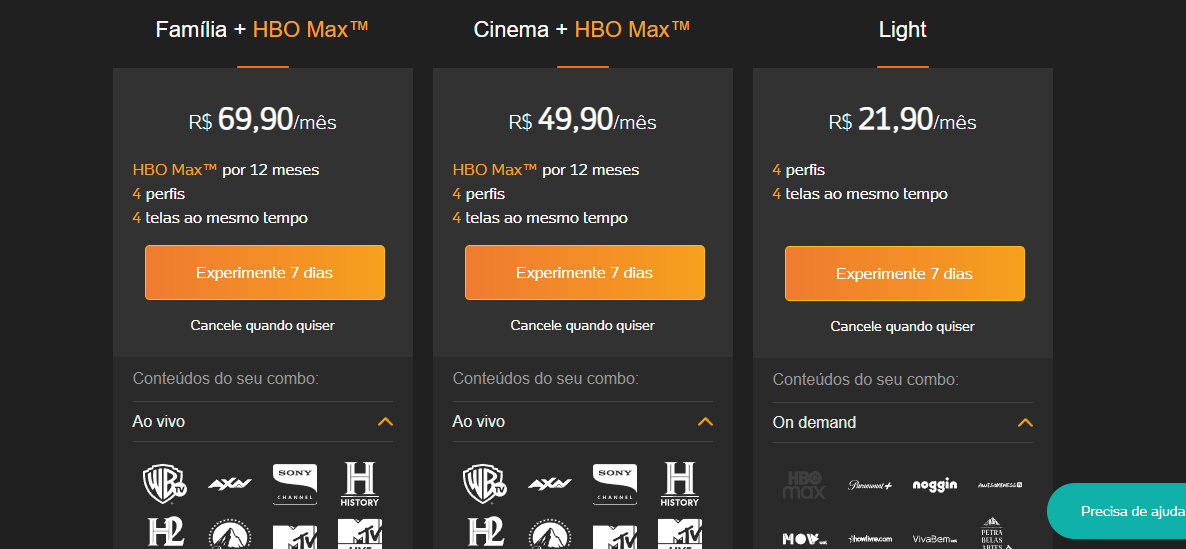Apesar de não disporem dessas duas opções esportivas, os planos “Cinema + HBO Max” e “Light” contam com diversos outros canais ao vivo — como Warner TV, Sony Channel, History etc. — e conteúdos on demand como Paramount Plus, Noggin, MOV e HBO Max por 12 meses no primeiro plano.