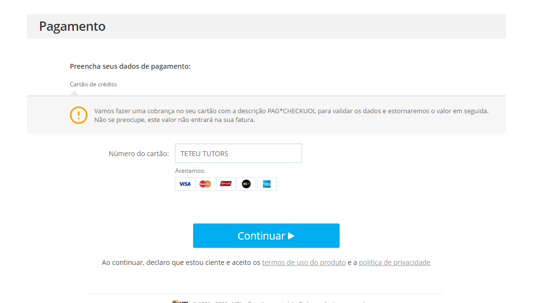Nesta etapa verifique se suas informações de pagamento estão corretas (nome, endereço, CPF etc.) e informe o número do cartão em que o valor da mensalidade será debitado.