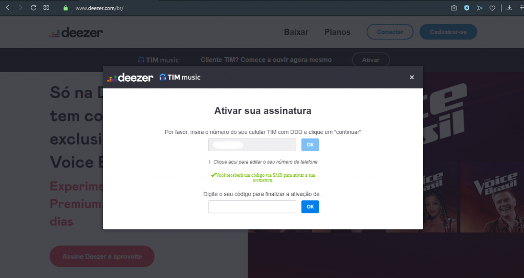 Ativando plano Deezer Premium da TIM no celular — Foto: Reprodução/Helito Beggiora