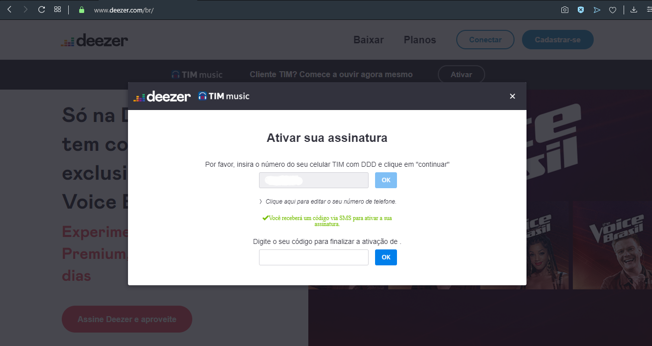 Ativando plano Deezer Premium da TIM no celular — Foto: Reprodução/Helito Beggiora