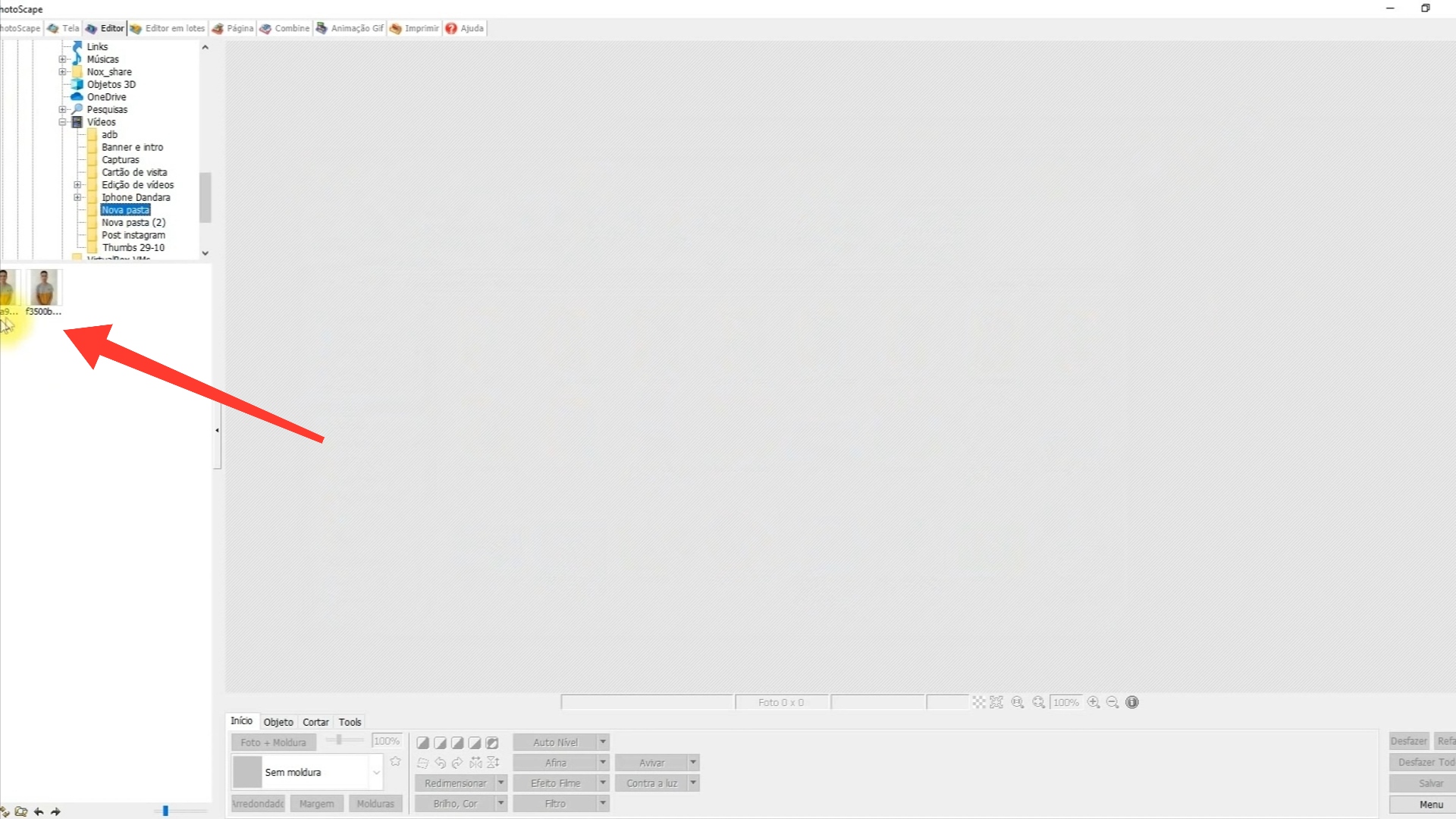 Abra o PhotoScape em seu computador e selecione sua foto com fundo branco. Para isso clique em ‘editor’ > selecione a pasta > selecione a imagem.