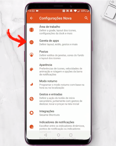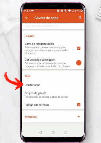 Agora, vá até a opção ‘gaveta de apps‘ e em seguida ‘ocultar apps‘.