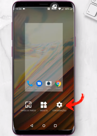 Assim como o anterior, instale-o, forneça todas às permissões necessárias e em seguida coloque-o como launcher padrão do sistema. Em seguida, pressione a tela por alguns segundos > configurações.