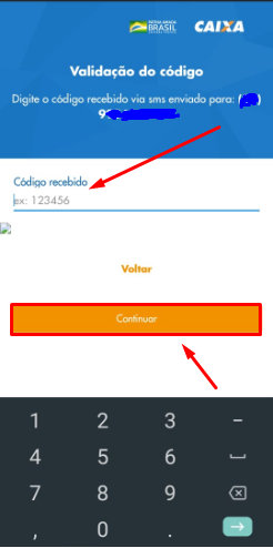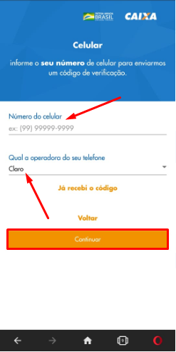 Digite seu CPF e confirme que não é um robô. Insira o código recebido via SMS anteriormente e toque sobre ‘Continuar‘.