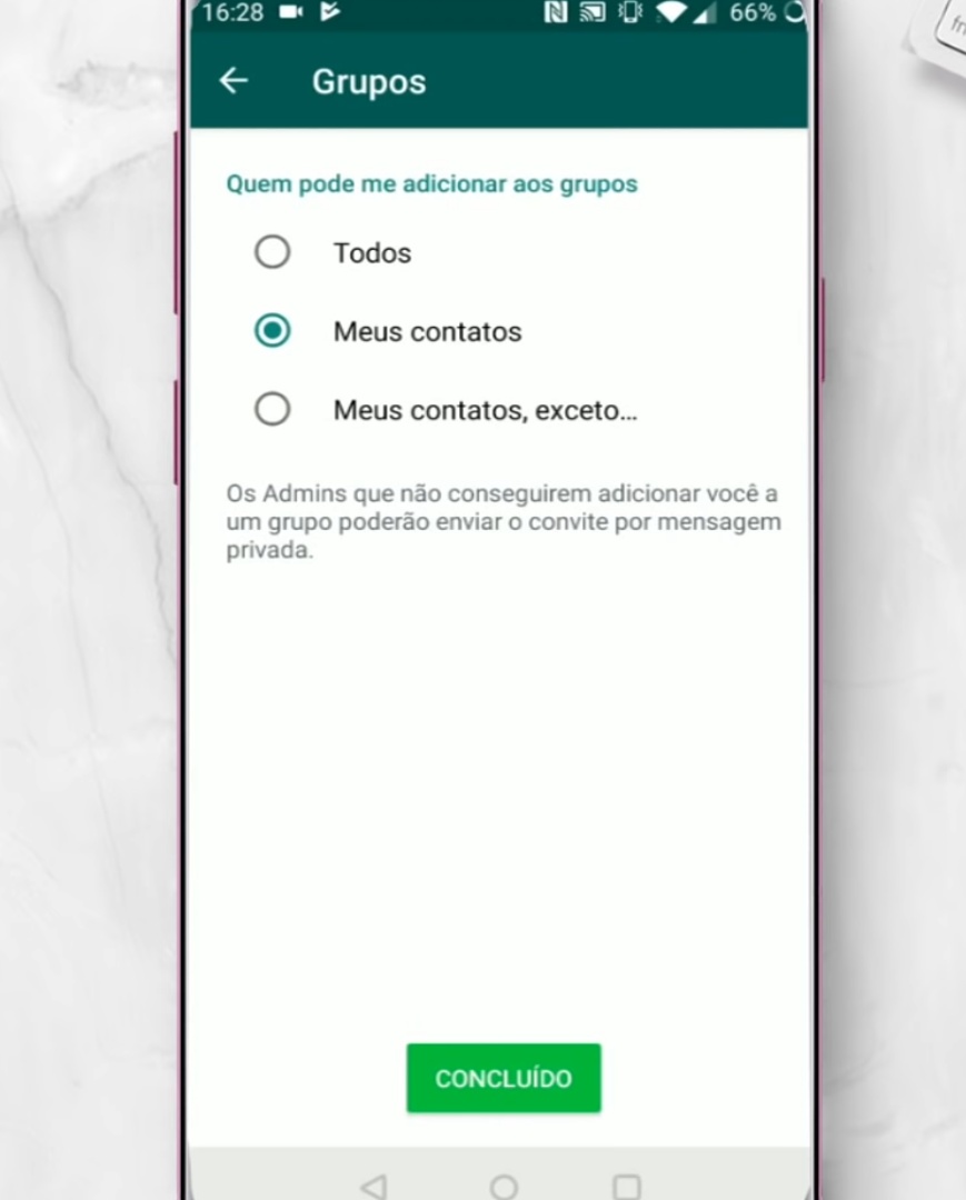 Neste último passo basta configurar a privacidade assim como no status do aplicativo, sendo possível permitir apenas que seus contatos te adicionem em grupos ou até mesmo bloquear alguns.